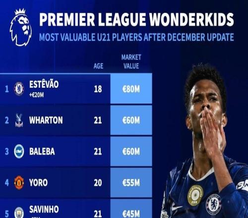 德转更新后英超U21球员身价TOP10:埃斯特旺8000万欧元第1