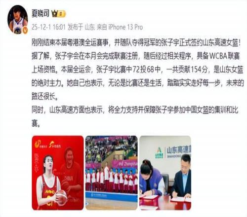 如今,好消息终于来了。根据山东媒体人夏晓司在社交平台的报道,“张子宇正式签约山东高速女篮!”